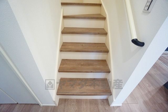 ご年配の方でも安心できる、手すり付き階段です^^段差も低めで設定されてますので安全性にも優れてますね^^