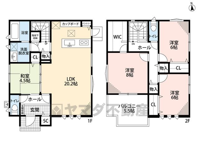 LDK20.2畳(1F)、和4.5畳(1F)、洋8畳(2F)、洋6畳(2F) |