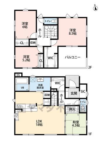LDK18畳(1F)、和4.5畳(1F)、洋8.5畳(2F)、洋6畳(2F)、洋5.2畳(2F)、S0畳(1F) |