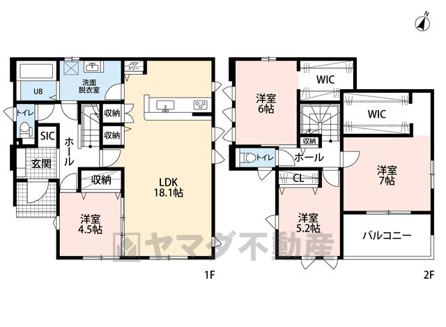 LDK18.1畳(1F)、洋4.5畳(1F)、洋7畳(2F)、洋6畳(2F)、洋5.2畳(2F) |