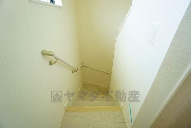 ご年配の方でも安心できる、手すり付き階段です^^段差も低めで設定されてますので安全性にも優れてますね^^
