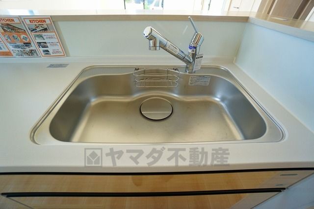 広々とした凸型シンクに洗剤ポケットを標準装備。大きなお鍋など洗いやすいです。洗剤や石鹸、スポンジもすっきりできる収納付き。