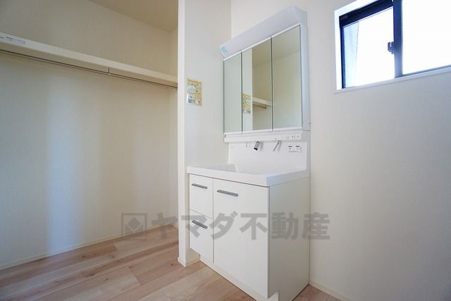 三面鏡つき洗面台。収納も一体型になっているので、ドライヤーやヘアアイロンの置き場に困りませんね。