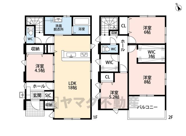LDK18畳(1F)、洋4.5畳(1F)、洋8畳(2F)、洋6畳(2F)、洋5.2畳 |
