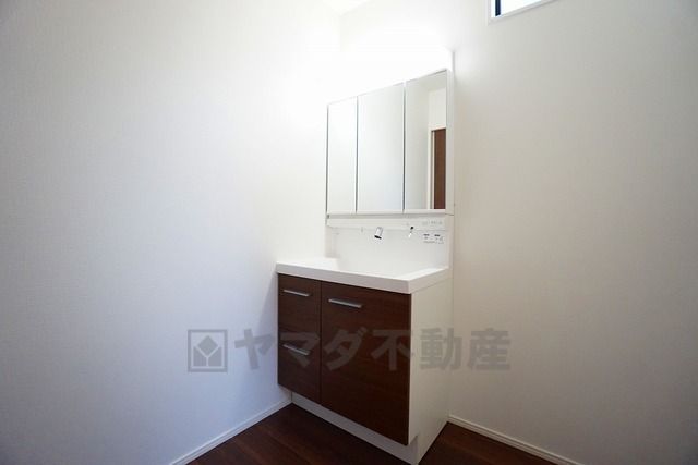 三面鏡つき洗面台。収納も一体型になっているので、ドライヤーやヘアアイロンの置き場に困りませんね。