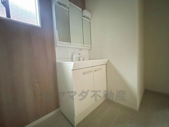 三面鏡つき洗面台。収納も一体型になっているので、ドライヤーやヘアアイロンの置き場に困りませんね。