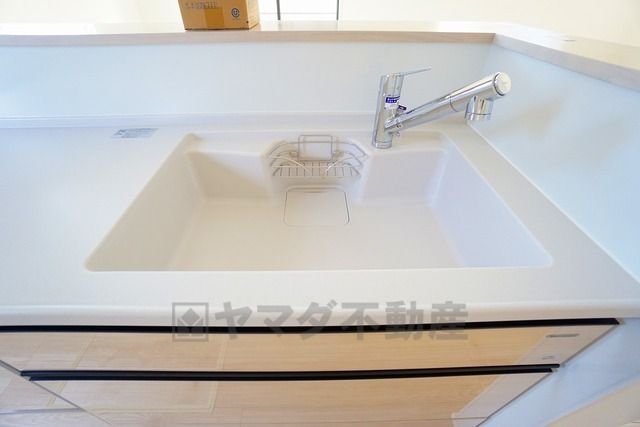 広々とした凸型シンクに洗剤ポケットを標準装備。大きなお鍋など洗いやすいです。洗剤や石鹸、スポンジもすっきりできる収納付き。
