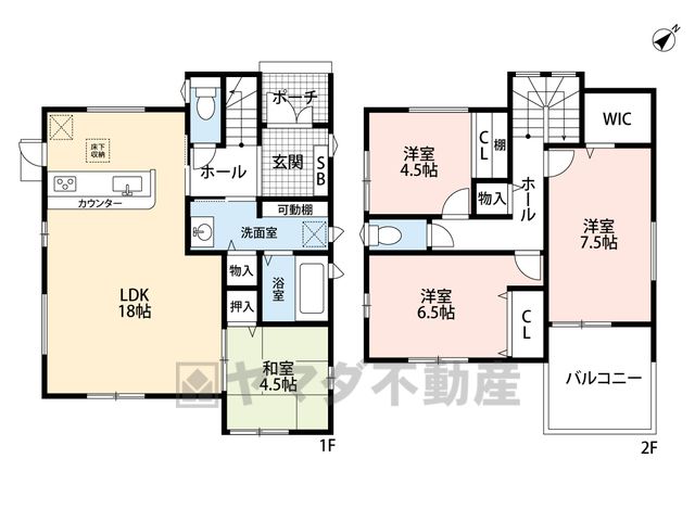 LDK18畳(1F)、和4.5畳(1F)、洋7.5畳(2F)、洋6.5畳(2F)、洋4.5畳(2F) |