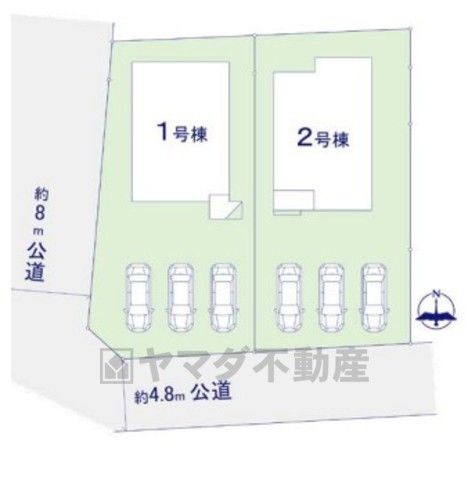2号棟。カースペース並列3台。 ご夫婦で1台ずつ所有出来ます^^ 前面道路は西側約8m、南側約4.8m。