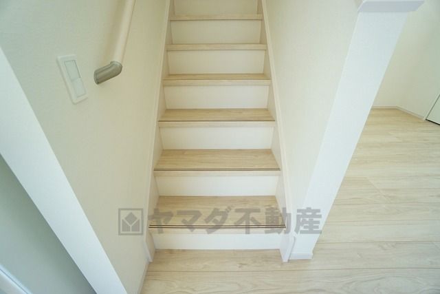 ご年配の方でも安心できる、手すり付き階段です^^段差も低めで設定されてますので安全性にも優れてますね^^