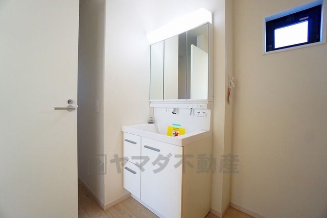 三面鏡つき洗面台。収納も一体型になっているので、ドライヤーやヘアアイロンの置き場に困りませんね。