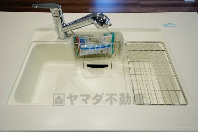 同仕様写真。広々とした凸型シンクに洗剤ポケットを標準装備。大きなお鍋など洗いやすいです。洗剤や石鹸、スポンジもすっきりできる収納付き。