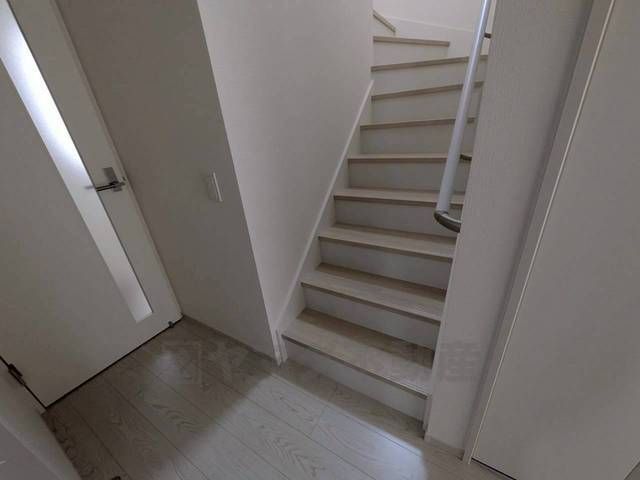 ご年配の方でも安心できる、手すり付き階段です^^段差も低めで設定されてますので安全性にも優れてますね^^