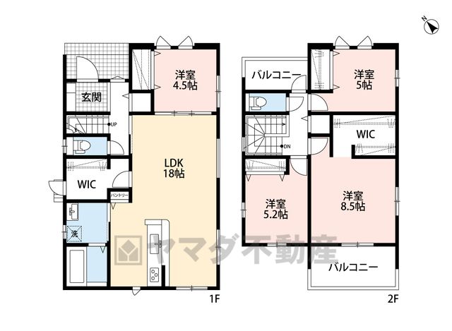 LDK18畳(1F)、洋4.5畳(1F)、洋8.5畳(2F)、洋5.2畳(2F)、洋5畳(2F) |