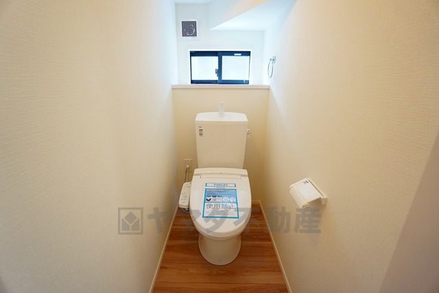 温水洗浄機付トイレです。節水機能もあるので、安心して使えますね。もちろん、1階2階の2ヶ所にトイレがあるので、忙しい朝にもゆとりができますね。