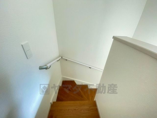 ご年配の方でも安心できる、手すり付き階段です^^段差も低めで設定されてますので安全性にも優れてますね^^