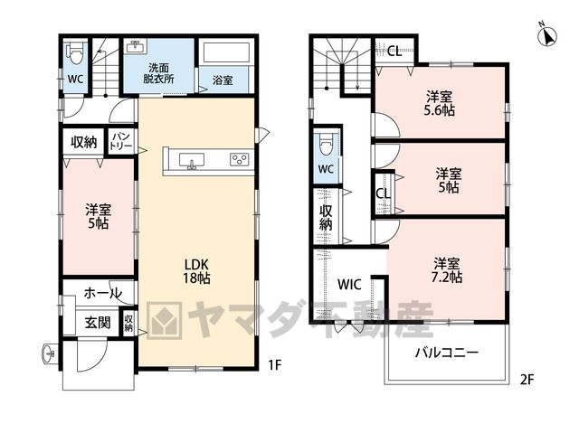 LDK18畳(1F)、洋5畳(1F)、洋7.2畳(2F)、洋5.6畳(2F)、洋5畳(2F) |