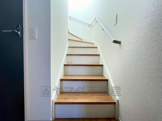 ご年配の方でも安心できる、手すり付き階段です^^段差も低めで設定されてますので安全性にも優れてますね^^