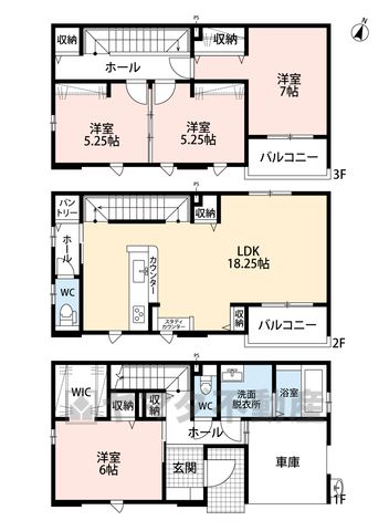LDK18.2畳(2F)、洋6畳(1F)、洋7畳(3F)、洋5.2畳(3F) |