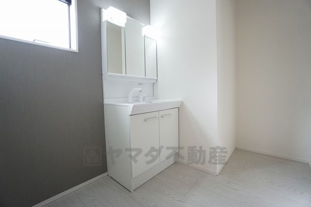 三面鏡つき洗面台。収納も一体型になっているので、ドライヤーやヘアアイロンの置き場に困りませんね。