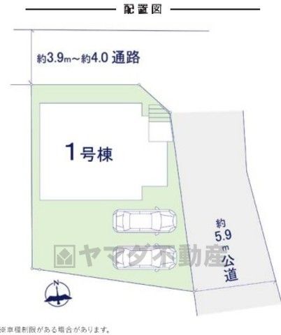 南東・北東の角地に位置し、並列2台駐車、ゆとりの敷地。前面道路は約5.9mで車の出し入れもスムーズです。