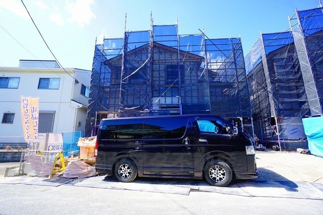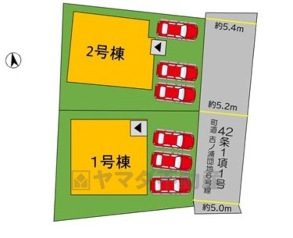 1号棟。カースペースは並列3台。前面道路は南東側約5~5.2m。 並列なのでスムーズに駐車出来ます^^