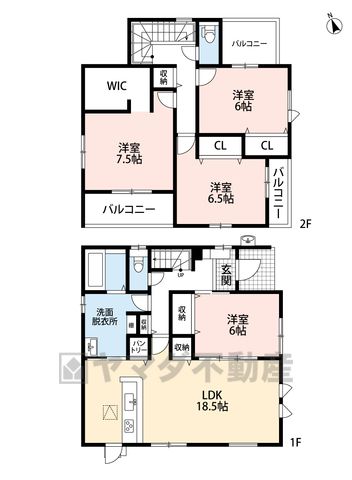 LDK18.5畳(1F)、洋6畳(1F)、洋7.5畳(2F)、洋6.5畳(2F)、洋6畳(2F) |