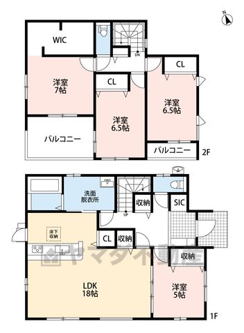 LDK18畳(1F)、洋5畳(1F)、洋7畳(2F)、洋6.5畳(2F)、洋6.5畳(2F) |