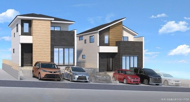 完成予想図。 ハイセンスな外観です。土地面積50坪以上。車もラクラク3台駐車できます。 最新の設備で新生活を^^