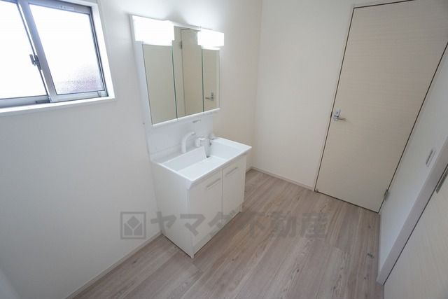 同仕様写真。収納が隠れて使いやすい、シャワー付き三面鏡洗面ドレッサーです。朝の準備もぬかりなくできます。