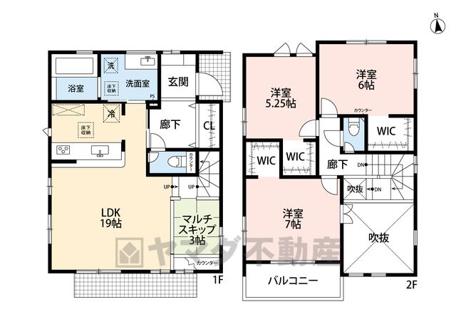 LDK19畳(1F)、洋7畳(2F)、洋6畳(2F)、洋5.2畳(2F)、その他3畳(1F) |