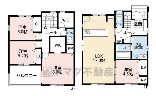 LDK17畳(1F)、洋4.5畳(1F)、洋8畳(2F)、洋5.2畳(2F)、洋5畳(2F) |