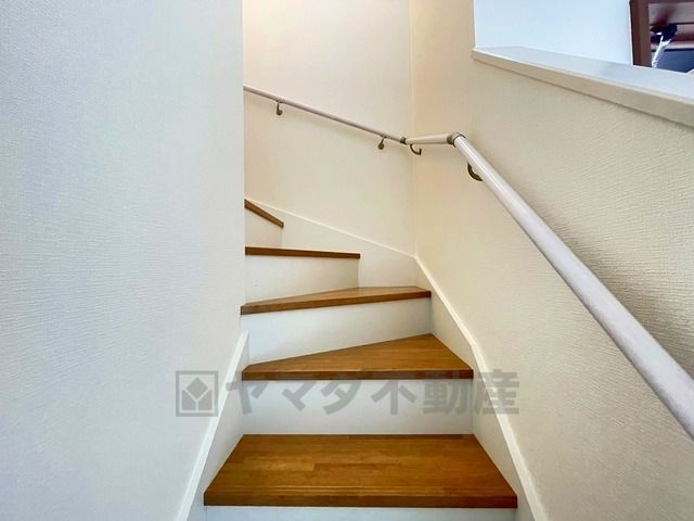 ご年配の方でも安心できる、手すり付き階段です^^段差も低めで設定されてますので安全性にも優れてますね^^