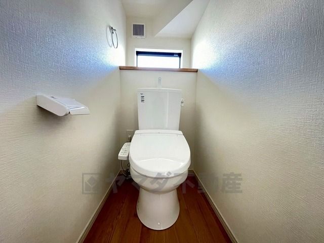 温水洗浄機付トイレです。節水機能もあるので、安心して使えますね。もちろん、1階2階の2ヶ所にトイレがあるので、忙しい朝にもゆとりができますね。