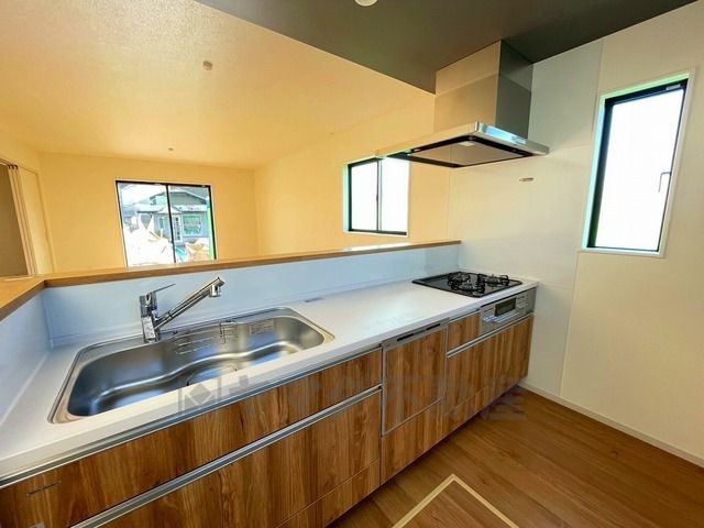 対面式カウンターキッチンでお子様の様子が見守れます。カウンタートップは耐熱性に優れており、日ごろのお掃除もふき取るだけでOK。ステンレスシンクも簡単にお掃除できますよ。