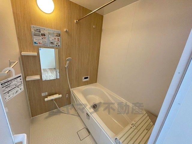 1日の疲れを癒すくつろぎのバスルーム。足を伸ばしてもゆったりと入れるサイズです。お子様と一緒にお風呂に入っても狭くないですね^^