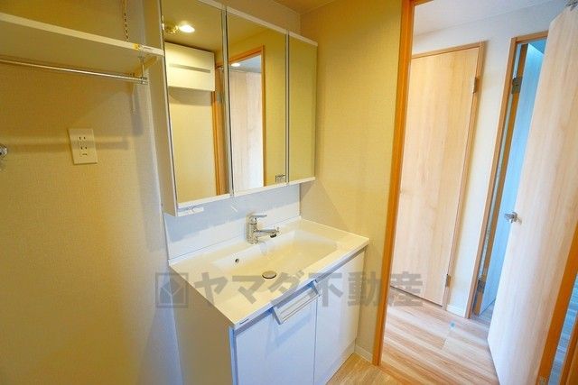 三面鏡つき洗面台。収納も一体型になっているので、ドライヤーやヘアアイロンの置き場に困りませんね。