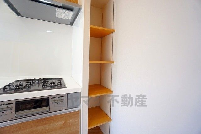 キッチン横の棚。日用品や食品のストック場所として活躍できます。