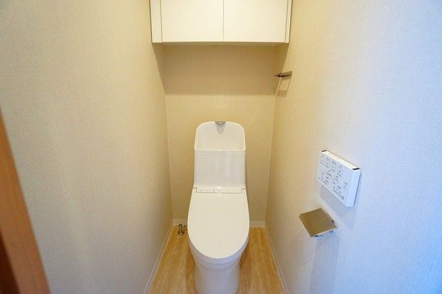 温水、暖房、ウォシュレット付の高機能トイレ。汚れが付きにくく、落ちやすい加工がされており、お掃除もラクラクです。