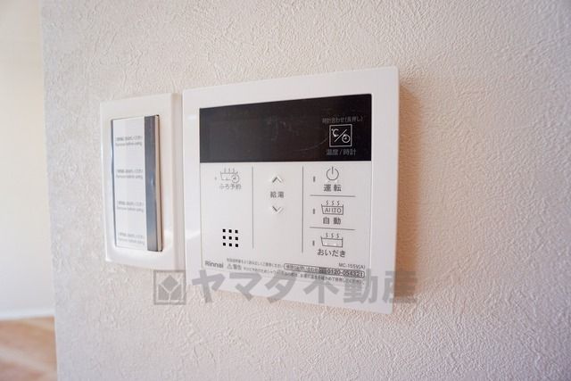 キッチン横からお湯張り、追い炊き、足し湯がボタン一つで楽々操作できる給湯機リモコンです^^忙しい夕飯の準備の時間帯に重宝しますね。