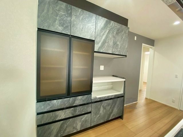 キッチンにはカップボードを設置。食器や家電をすっきり収納でき、作業スペースも広く快適です。