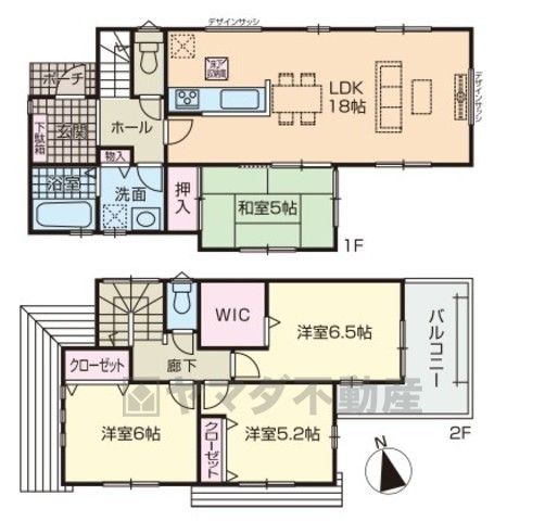 LDK18畳(1F)、和5畳(1F)、洋6.5畳(2F)、洋6畳(2F)、洋5.2畳(2F) |