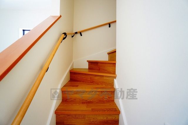 ご年配の方でも安心できる、手すり付き階段です^^段差も低めで設定されてますので安全性にも優れてますね^^