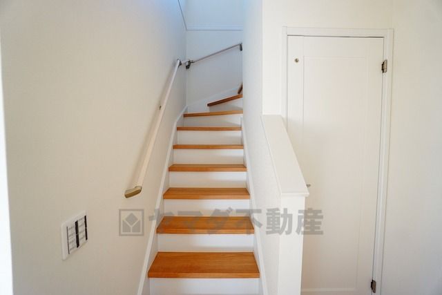 ご年配の方でも安心できる、手すり付き階段です^^段差も低めで設定されてますので安全性にも優れてますね^^