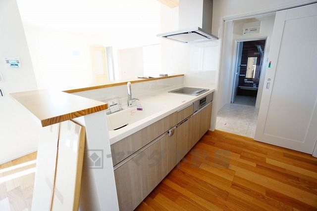 対面式カウンターキッチンでお子様の様子が見守れます。カウンタートップは耐熱性に優れており、日ごろのお掃除もふき取るだけでOK。ステンレスシンクも簡単にお掃除できますよ。