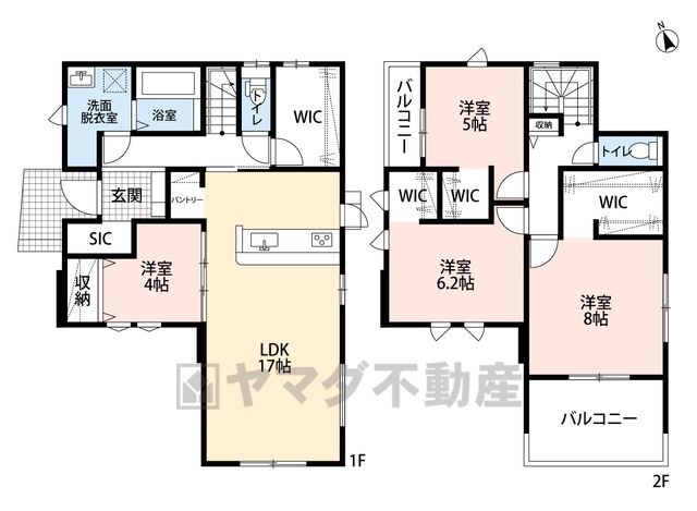 LDK17畳(1F)、洋4畳(1F)、洋8畳(2F)、洋6.2畳(2F)、洋5畳(2F) |