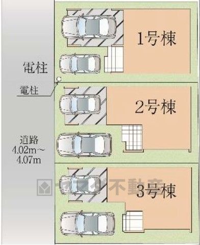1号棟。前面道路は南西側約4m。 カースペースは並列2台分を確保。 ご夫婦で1台ずつ所有できます。