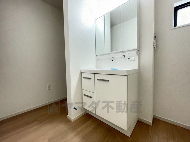 三面鏡つき洗面台。収納も一体型になっているので、ドライヤーやヘアアイロンの置き場に困りませんね。