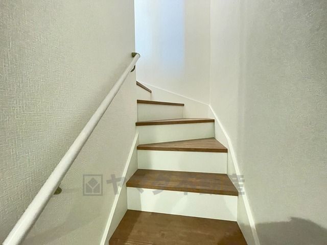 ご年配の方でも安心できる、手すり付き階段です^^段差も低めで設定されてますので安全性にも優れてますね^^