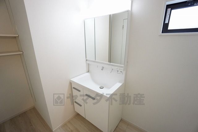 同仕様写真。三面鏡つき洗面台。収納も一体型になっているので、ドライヤーやヘアアイロンの置き場に困りませんね。